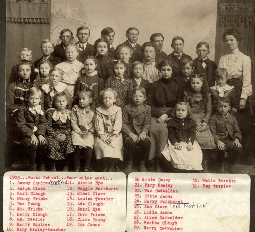 1. Sammy Squires, 2. Ralph Clare, 3. Burt Clough, 4. Henry Fricke, 5. Rex Young, 6. Wm Fricke, 7. Harry Cough, 8. Wm. Tessier, 9. Harry Squires, 10. Mary Healey-teacher, 11. Winnie Nye, 12. Maggie Parkhurst, 13. Ethel Clare, 14. Louise Tessier, 15. Ada Clough, 16. Pearl Nye, 17. Vern Fricke, 18. Clare Young, 19. Ida Janna, 20. Ernie Davey, 21. Mary Healey, 22. Max Cadwalder, 23. Ottie Janna, 24. Harry Parkhurst, 25. Sam Clare, 26. Lidia Janna, 27. Alice Cadwalder, 28. Bertha Clough, 29. Harry Cadwalder