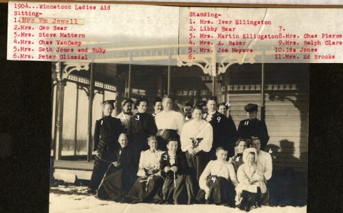 Sitting: 1. Mrs. Wm. Jewell, 2. Mrs. Geo. Bear, 3. Mrs. Steve Mattern,
