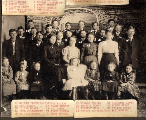 Baker School 4 1/2 miles north west 1. Sally McGee, 2. Maude Lloyd, 3. Blanche Lloyd, 4. Nelliebee Baker, 5. Mabel Lloyd, 6. Martha Jeananott, 7. Mabel Rohrer, 8. Henry Rohrer, 9. Joe Kocina, 10 Ellinor Davey, 11. Carrie Flickinger, 12. Anna McKee, 13. Lizzie McGee, 14. Paul Jeanantott, 15. Ed Jeanantott, 16. Ray Kocina, 17. Harry Rohrer, 18. Vac Jirak, 19. James Kocina, 20. John Kocina, 21. Willie Kocina, 22. Frankie McGee, 23. Vincent Zila, 24. August Jeanantott, 25. Clarence Lloyd, 26. Eddie Jirak, 27. Roy Rohrer