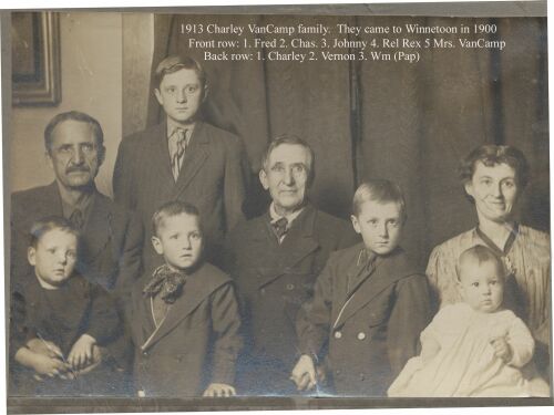 4. Rel Rex, 5. Mrs. VanCamp Back row: 1. Charley, 2. Vernon, 3. Wm. (Pap)