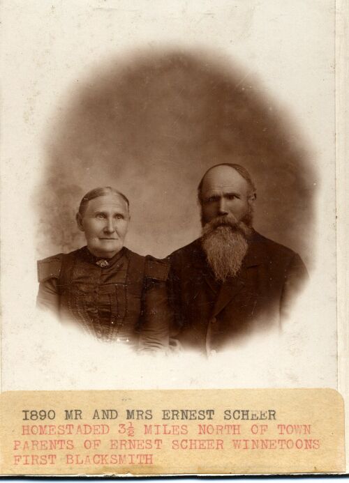 Homesteaded 3 1/2 miles north of town parents of Ernest Scheer Winnetoon's first blacksmith