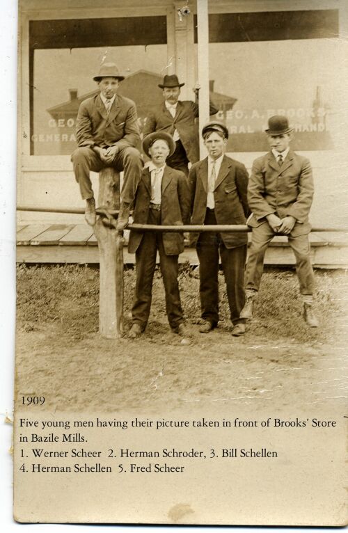 1909: Five young men having their picture taken in front of Brooks' Store in Bazile Mills.