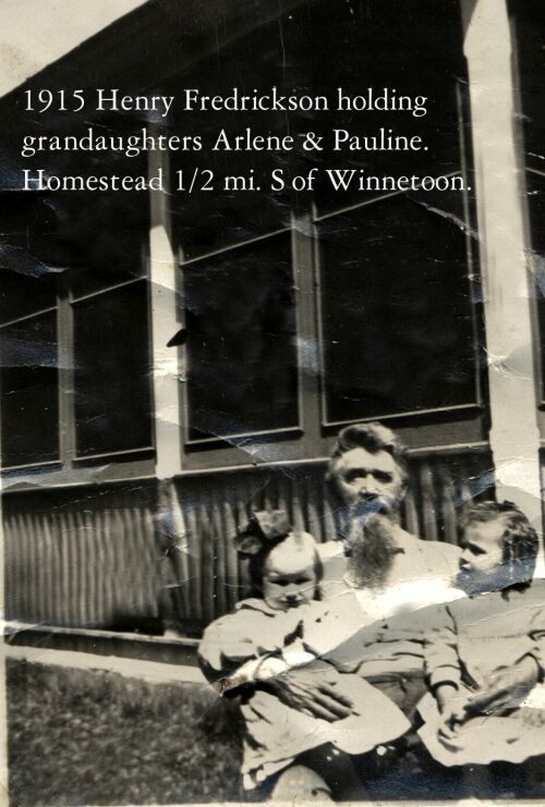 Henry Fredrickson holding granddaughters Arlene & Pauline. Homestead 1/2 mi. S. of Winnetoon.