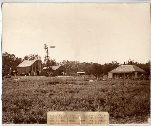 Jim Johnson farm, Mr. and Mrs. Johnson are in this picture. Lyle and Clyde are on the horses.